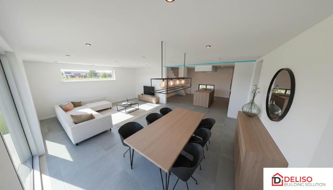 La maison sera équipée de: 4 chambres – dressing – bureau – cuisine équipée avec ilot central (électro Siemens – plaque vitro, lave-vaisselle, four micro-onde, four, frigo et hotte) – une salle de bain meublée avec douche, baignoire et WC – une deuxième salle d’eau avec WC – living avec salle à manger et cuisine ouverte– buanderie – 1 WC séparé – Chauffage sol (tout le rez + SDB à l’étage) par pompe à chaleur avec production d’eau chaude sanitaire, la pompe à chaleur permet également de refroidir de quelques degrés lors des fortes chaleurs – Installation photovoltaïque – ventilation simple flux type C+ – citerne eau de pluie avec groupe hydrophore – châssis PVC double vitrage avec invisivent – garage.