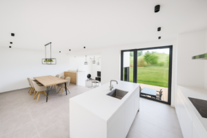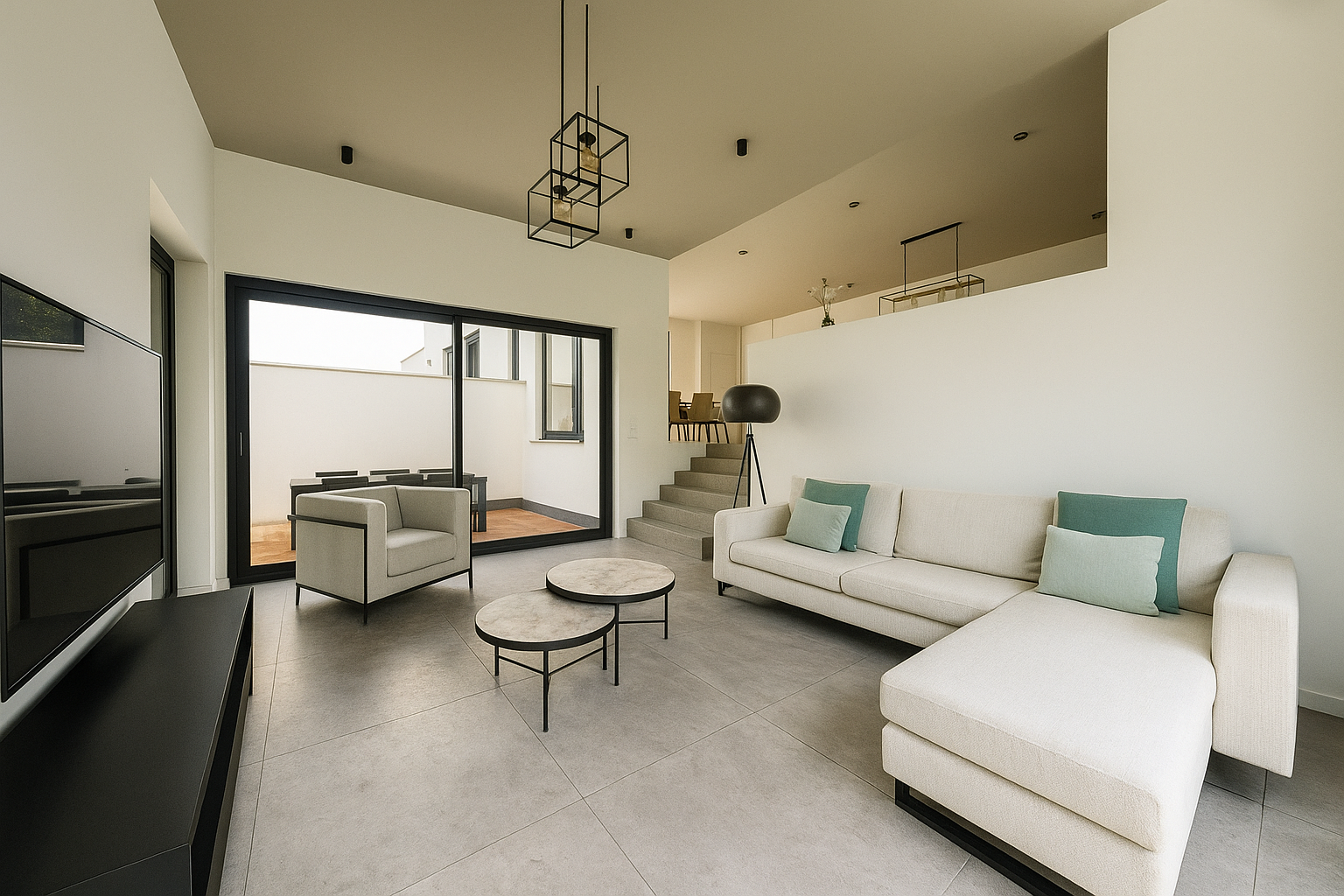 Les murs et plafonds sont enduits d’un primer suivi d’une peinture blanche pour une finition propre et durable. Le rez-de-chaussée et la salle de bain disposent de grands carrelages rectifiés, tandis que les chambres, le dressing et le hall de nuit sont habillés d’un parquet chaleureux.